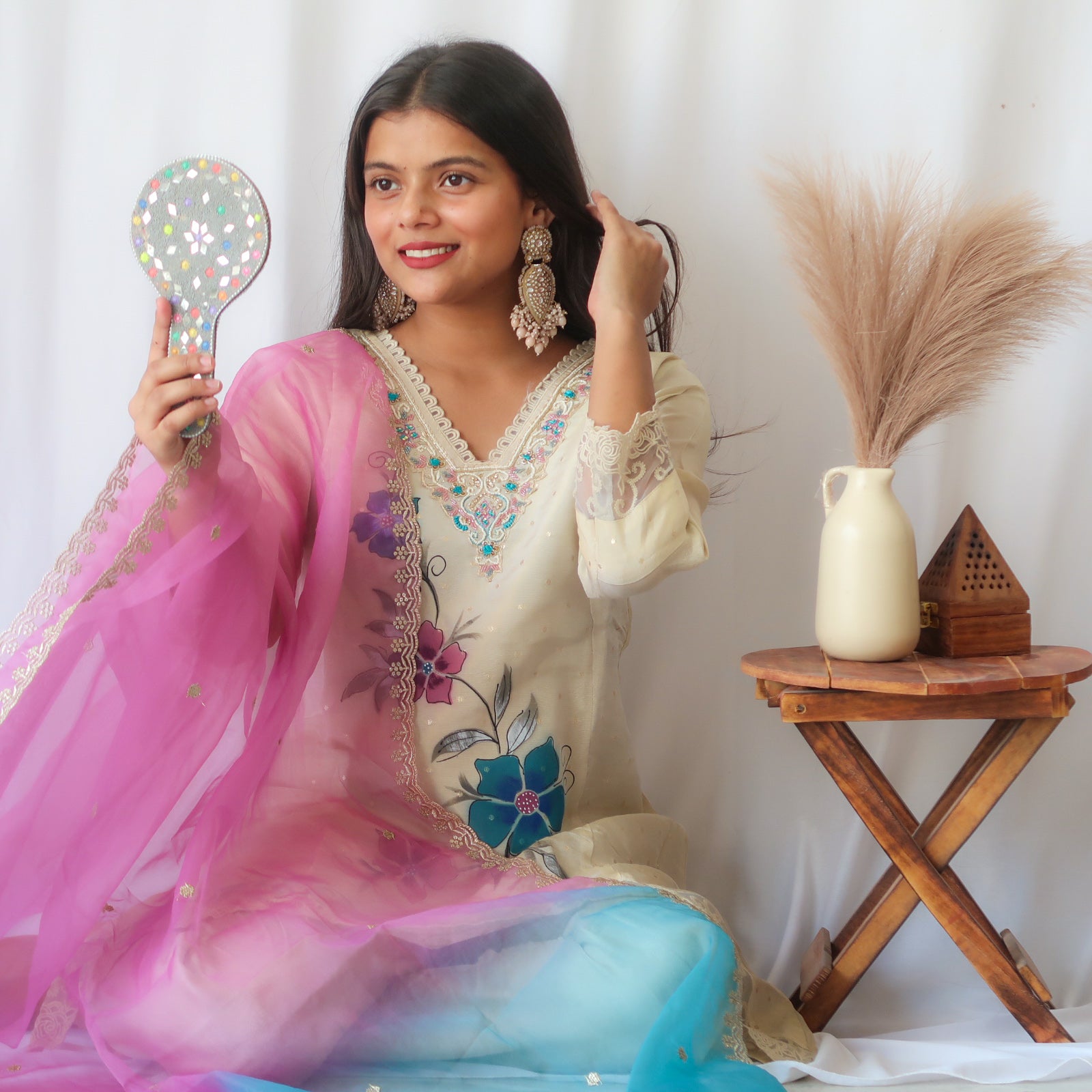 Introducing our Premium Three-Piece "Ivory Garden Suit Set," a stunning ensemble designed to exude elegance and charm. The off-white princess-cut kurta is adorned with delicate floral prints spaced throughout, adding a fresh and graceful touch. The front of the kurta features intricate sequin, moti, and pittan work, creating a luxurious focal point that highlights the craftsmanship.