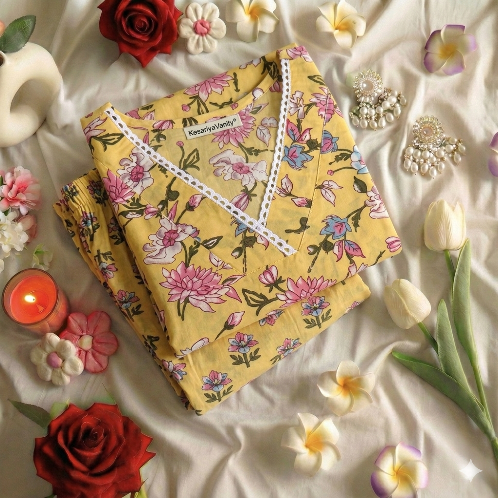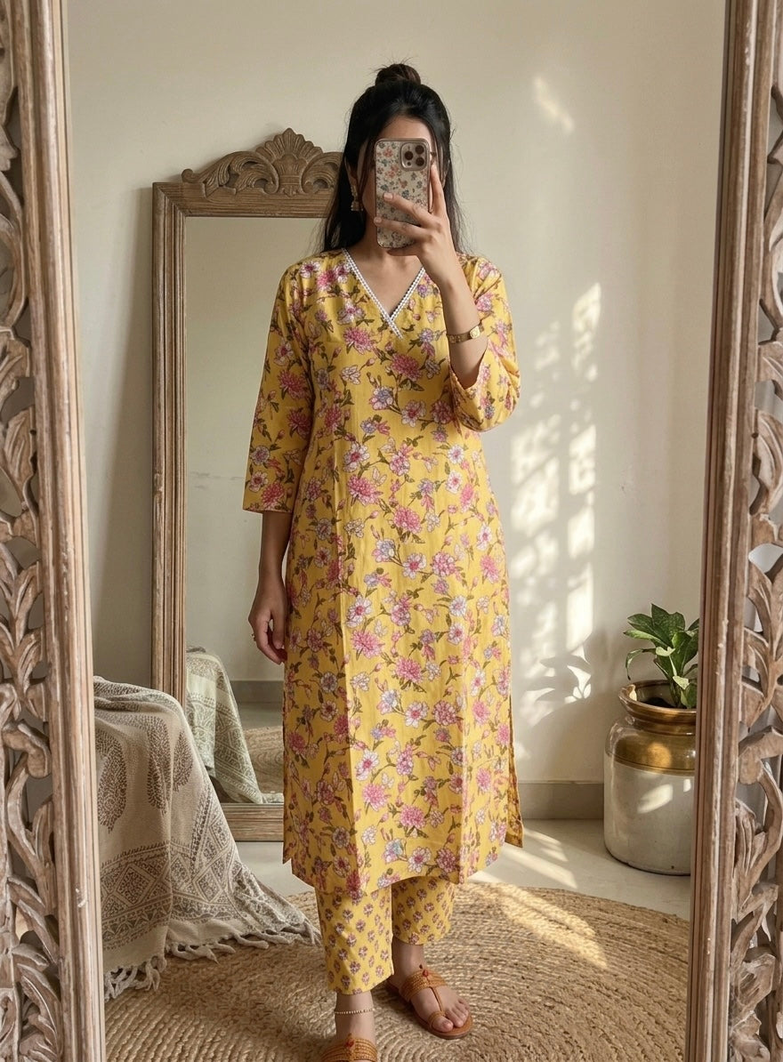 The kurta, tailored in a classic straight style. Each bloom is intricately printed, creating a mesmerizing tapestry of color and texture reminiscent of a majestic garden in full bloom.